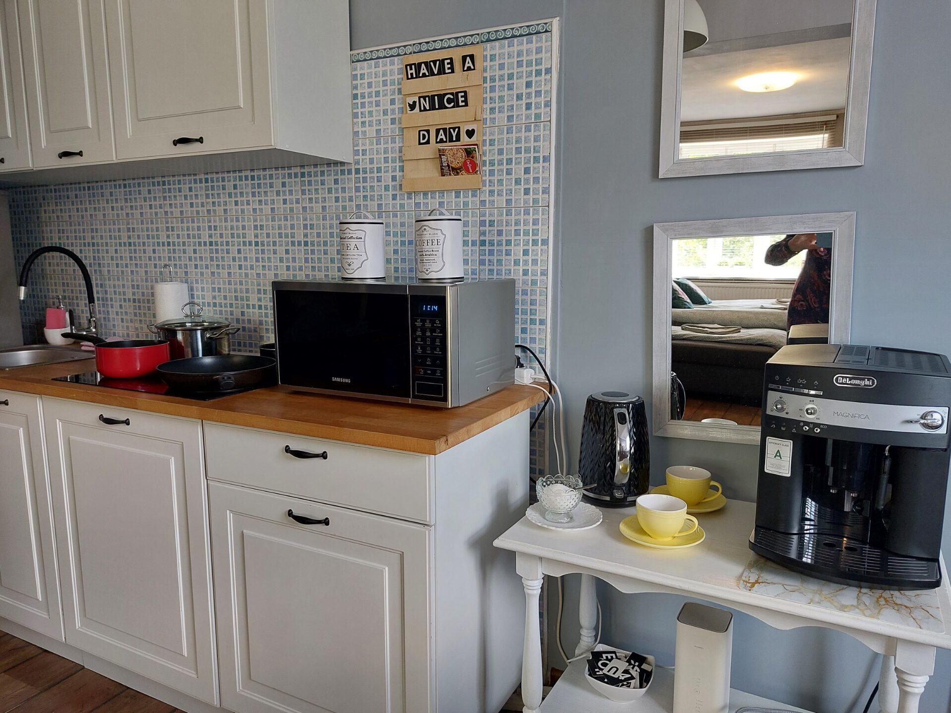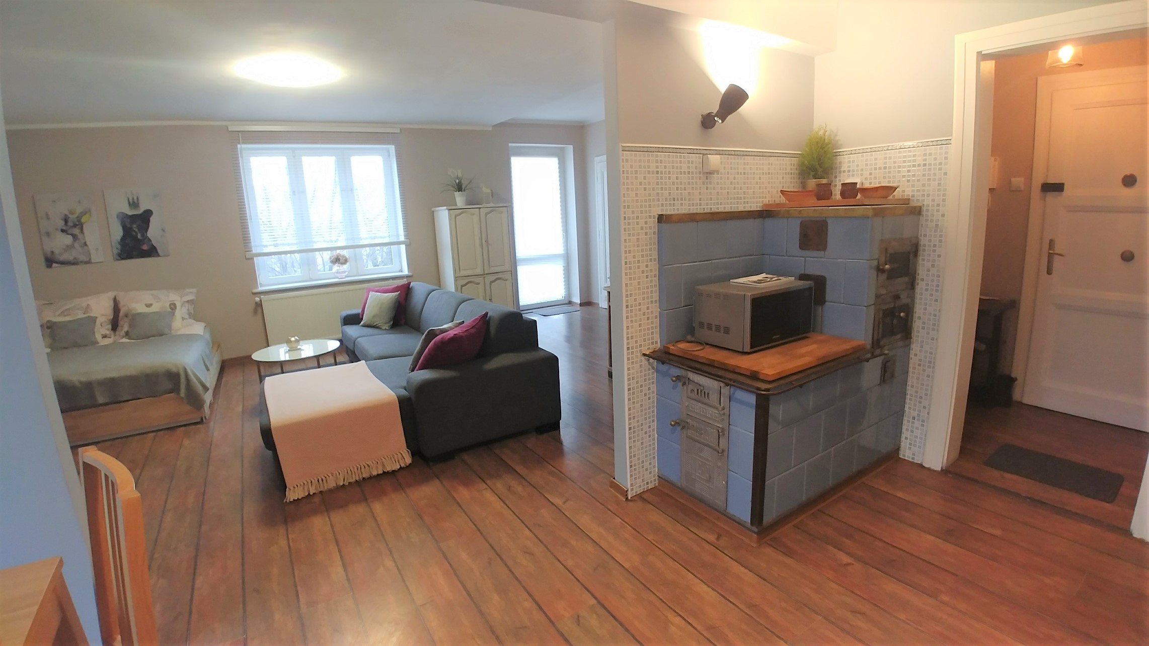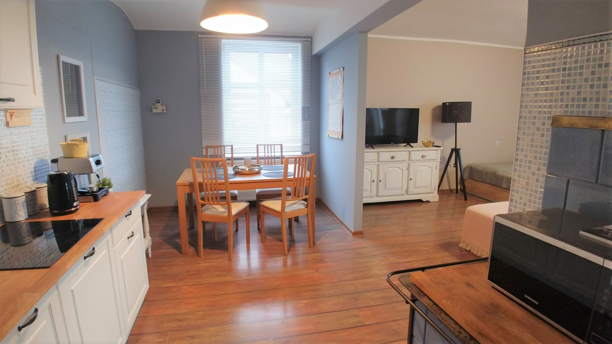 - w aneksie kuchennym lodówka z zamrażalnikiem, płyta grzewcza, kuchenka mikrofalowa, czajnik elektryczny, ekspress do kawy, pełna zastawa stołowa, garnki i akcesoria do sporządzania posiłków. W ramach poczęstunku dla gości : kawa, herbata, cukier oraz słodka niespodzianka.
