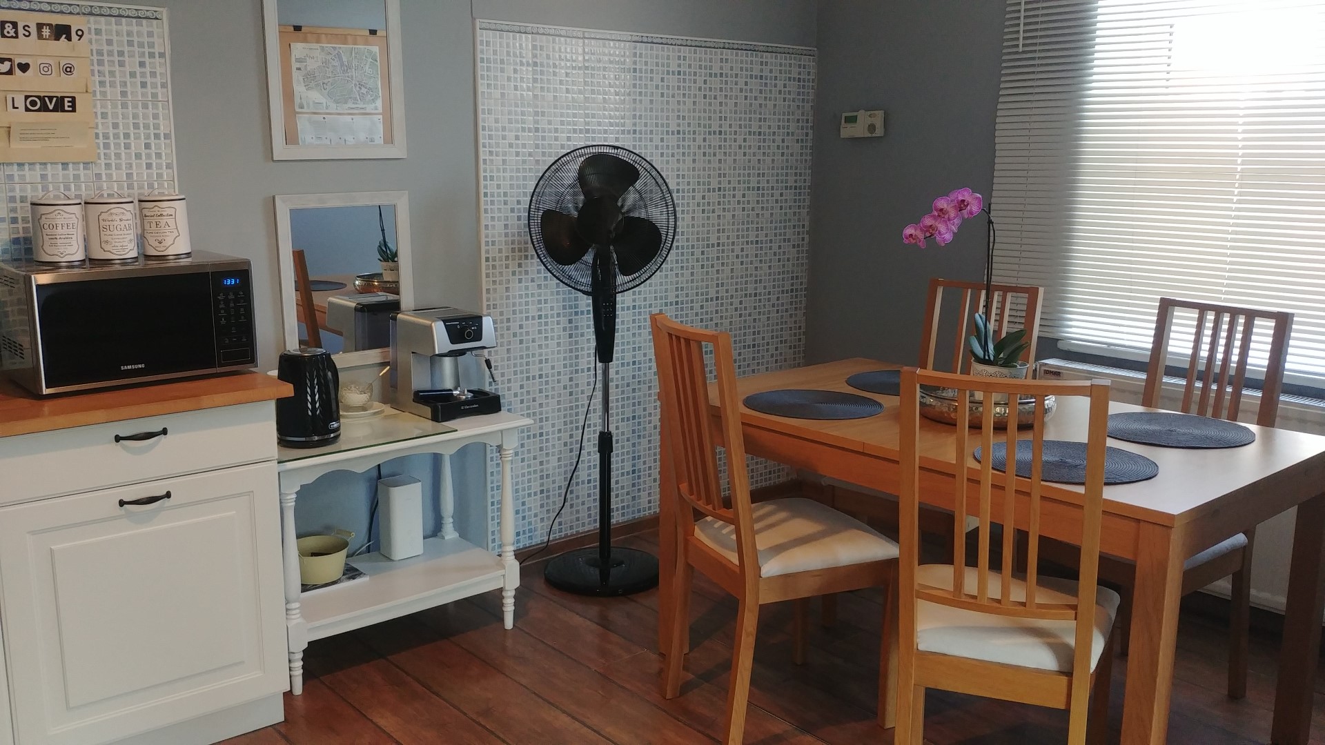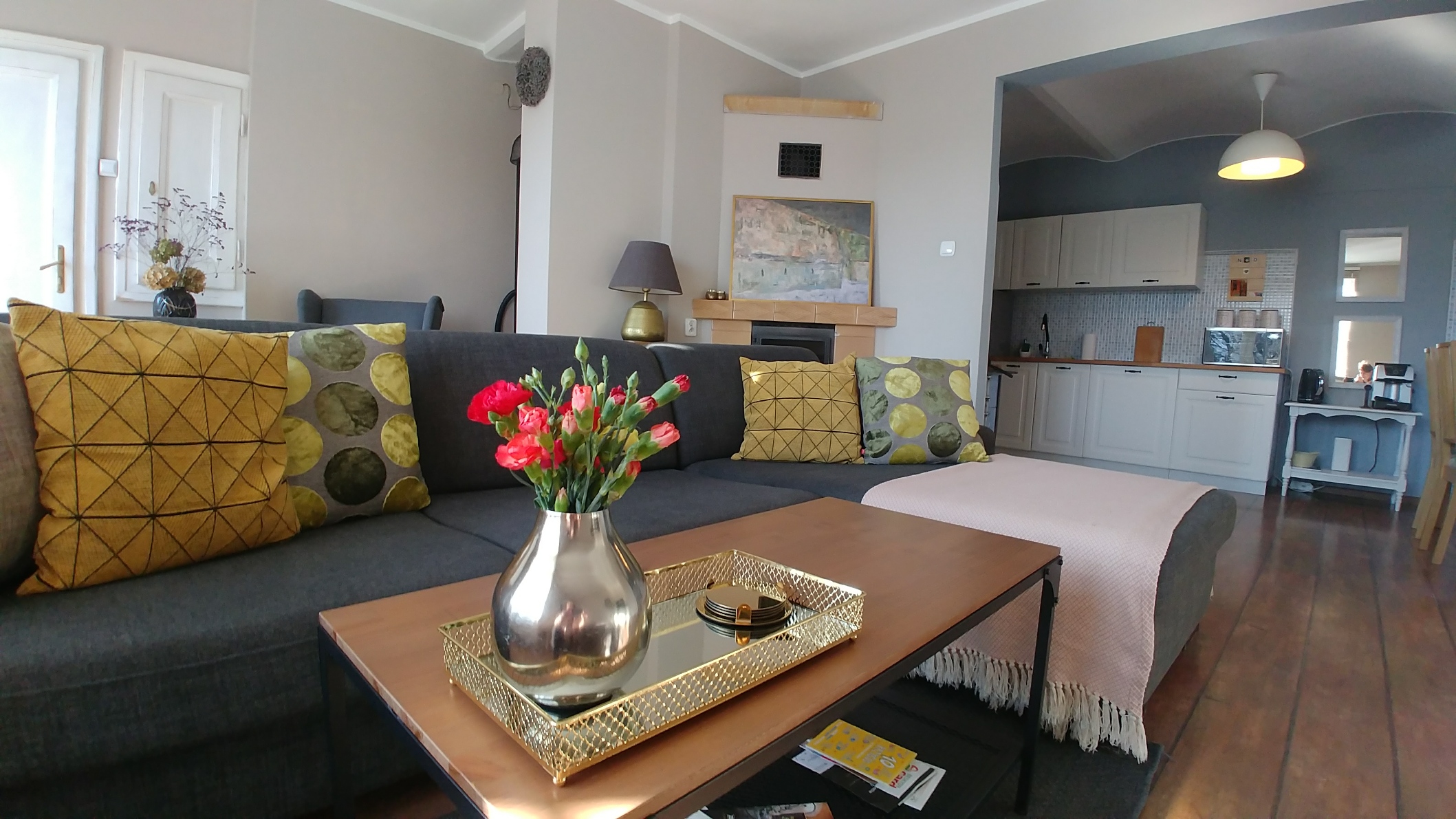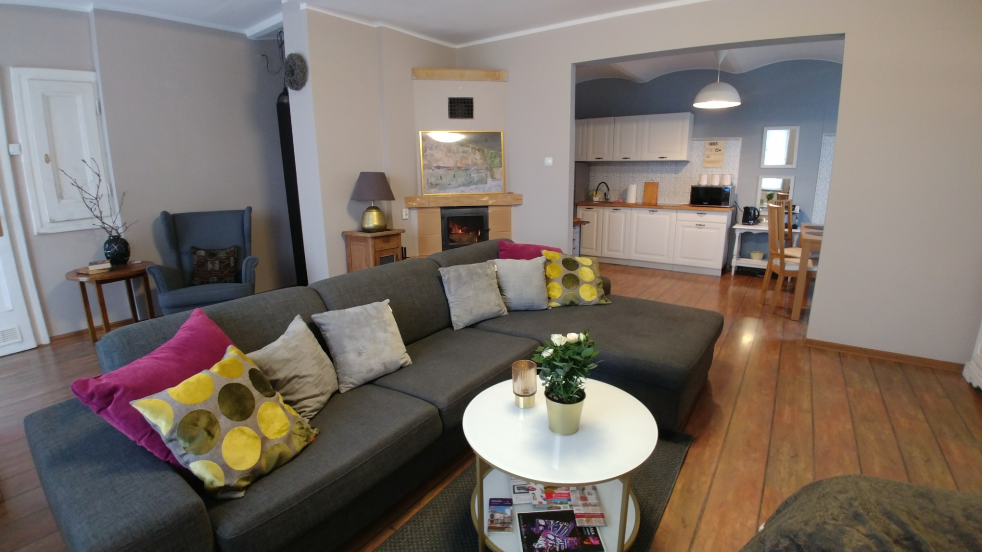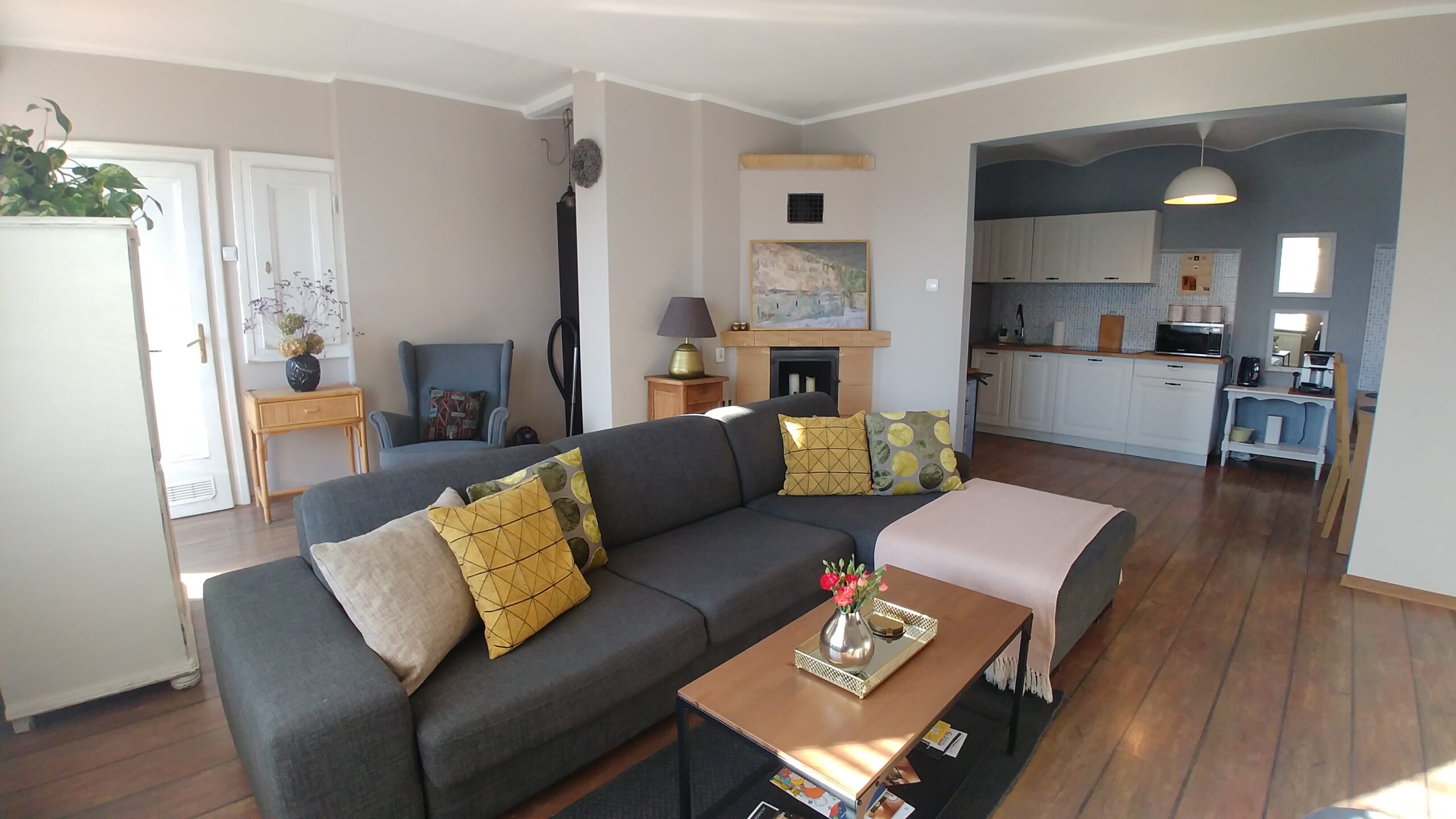 - w aneksie kuchennym lodówka z zamrażalnikiem, płyta grzewcza, kuchenka mikrofalowa, czajnik elektryczny, ekspress do kawy, pełna zastawa stołowa, garnki i akcesoria do sporządzania posiłków. W ramach poczęstunku dla gości : kawa, herbata, cukier oraz słodka niespodzianka.
