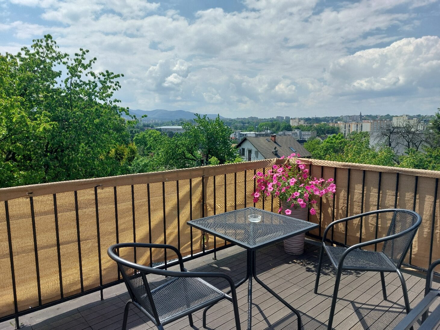 Z okien o raz tarasu roztacza się piękny widok na panoramę miasta oraz góry.