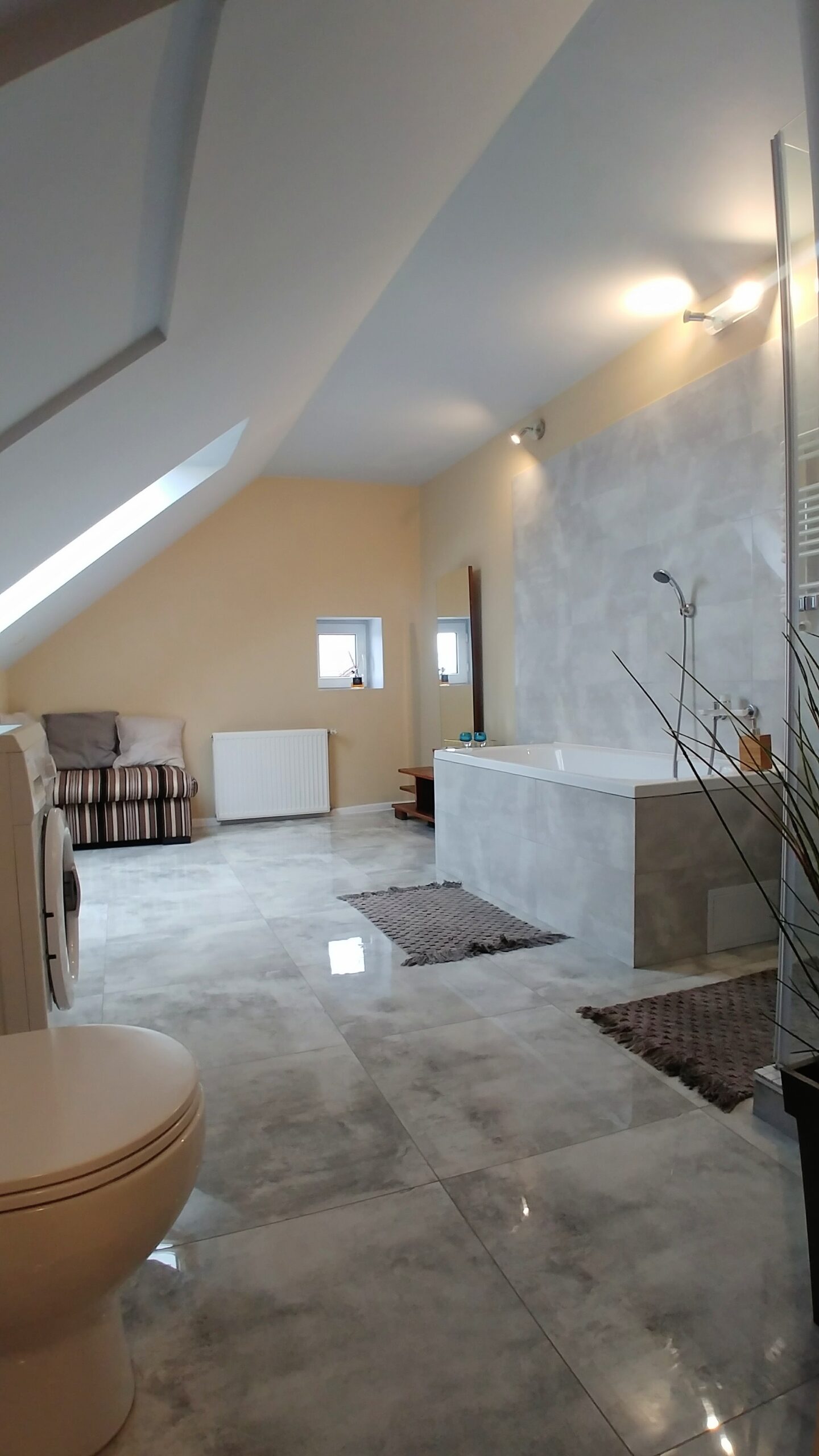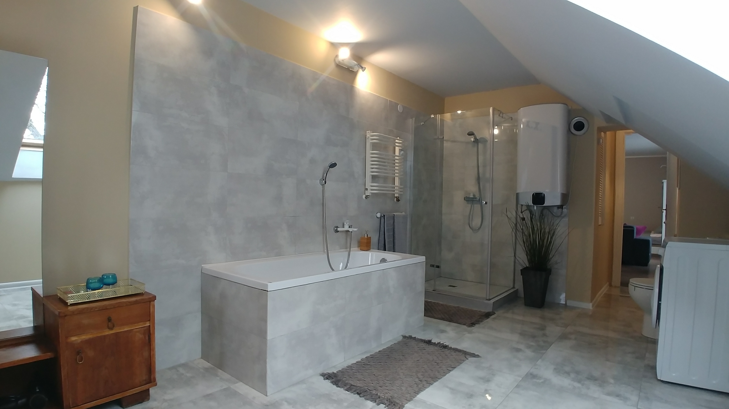 - w salonie kąpielowym wanna, prysznic, pralka + suszarka tradycyjna, ręczniki, podstawowe artykuły higieniczne i kosmetyki, suszarka do włosów,